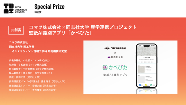 コマツ株式会社(以下、「当社」)と同志社大学 理工学部インテリジェント情報工学科 知的機構研究室(奥田正浩教授)の産学連携プロジェクトで共同開発した壁紙AI識別アプリ『かべぴた』の取り組みが、「第1回 Tech Direction Awards」にてSpecial Prizeの共創賞を獲得しました。