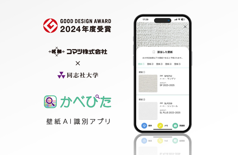 コマツ株式会社(以下、「当社」)と同志社大学 理工学部インテリジェント情報工学科 知的機構研究室(奥田正浩教授)の産学連携プロジェクトで共同開発した壁紙AI識別アプリ『かべぴた』の取り組みが、「2024年度グッドデザイン賞」を受賞しました。