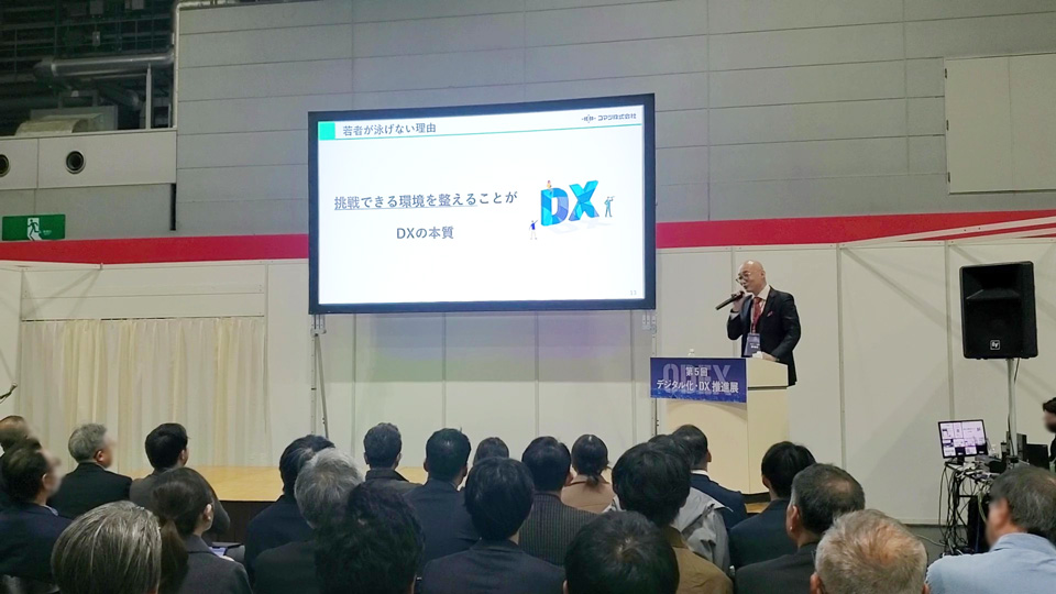 当社代表取締役の小松は、「DXとは”顔を水につける”勇気である ~AI時代を泳ぎ切るために~」と題し、自らDXの指揮を執ってきた実経験をもとに、組織に必要なDX推進のマインドを中心に講演を行いました。