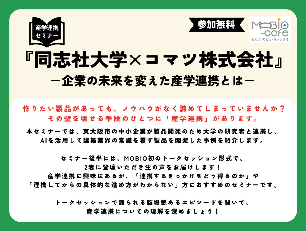 MOBIO-Cafe 産学連携セミナー「同志社大学×コマツ株式会社 企業の未来を変えた産学連携とは」が開催されます|同志社大学